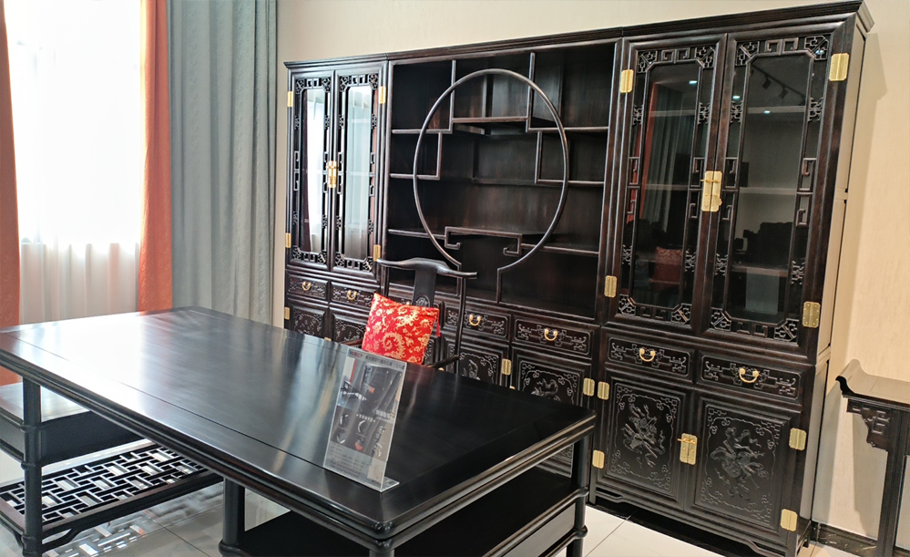 江蘇中尊木業(yè)有限公司書房系列產(chǎn)品:書房五件套草龍書柜、草龍大班枱、卷書寶座椅,洋花寫字枱等。